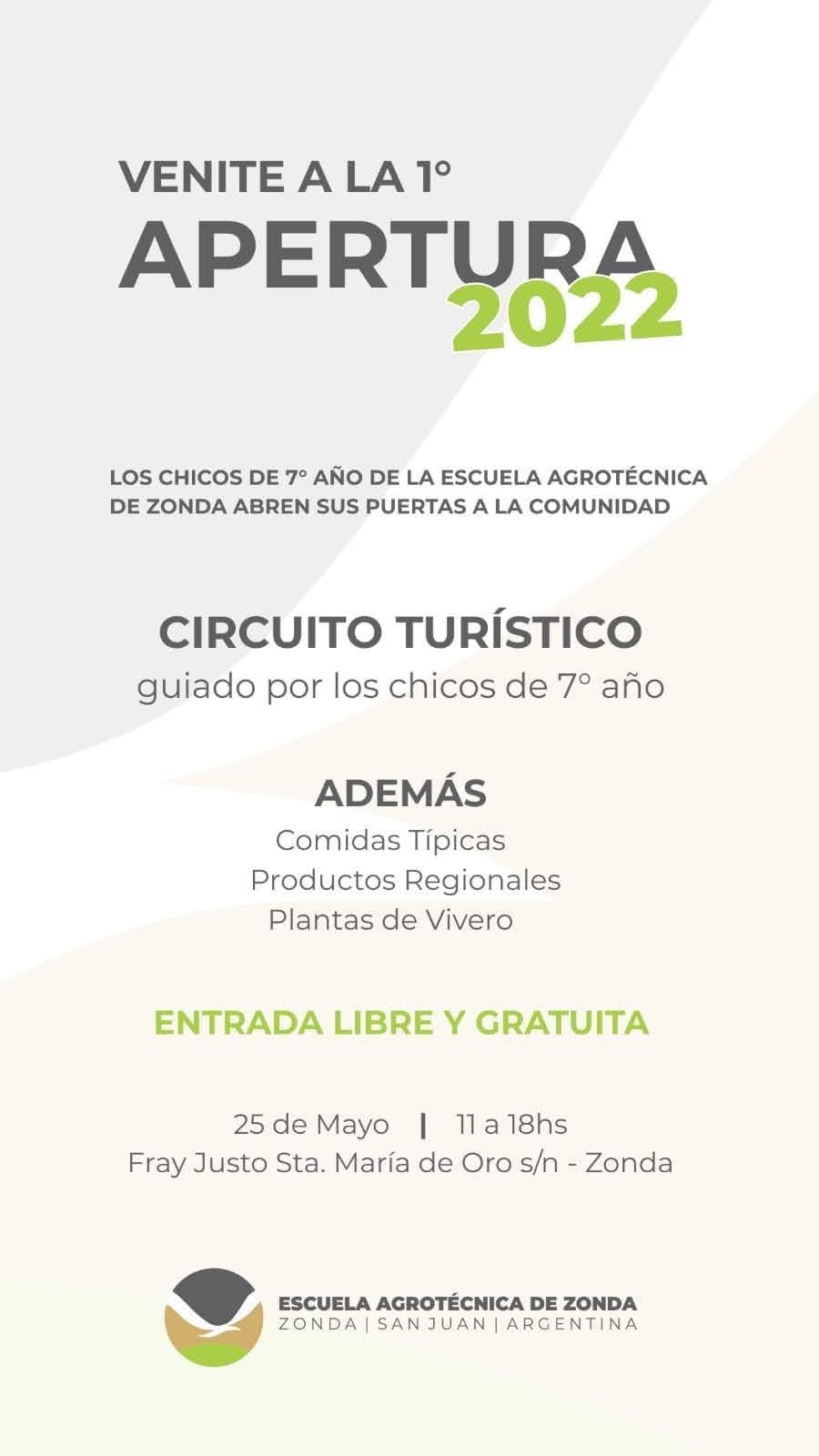 El próximo 25 de mayo, a partir de las 11, se realizará la Apertura 2022, comandada por alumnos de la escuela Agrotécnica de Zonda, en la institución, ubicada en Fray Justo Santa María de Oro s/n, en Zonda.