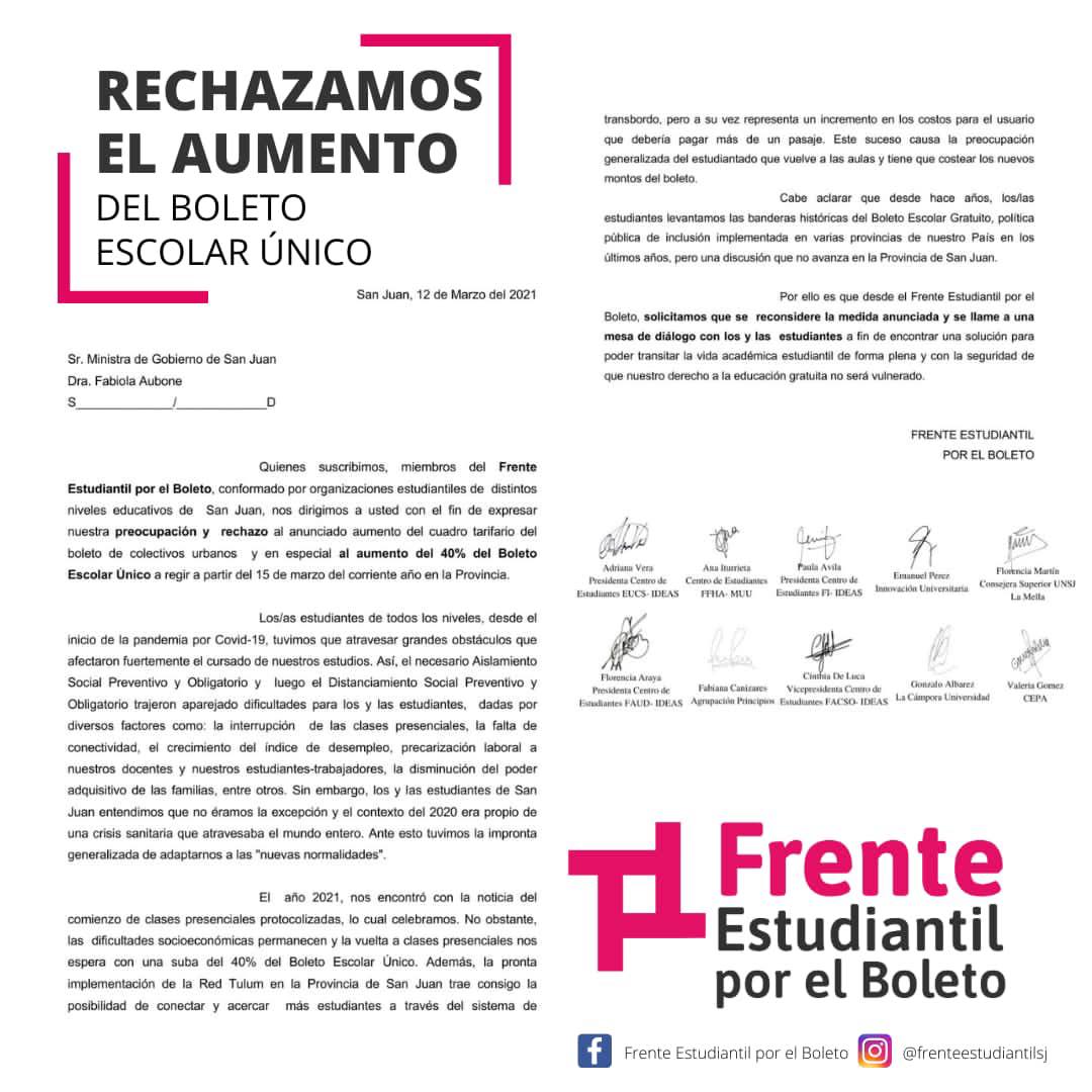 "Desde el Frente Estudiantil por el Boleto, presentamos formalmente a las autoridades del Ministerio de Gobierno de San Juan, a través del expediente 200-000130-2, nuestro rechazo al aumento del Boleto Escolar", indicaron desde la agrupación en un comunicado.