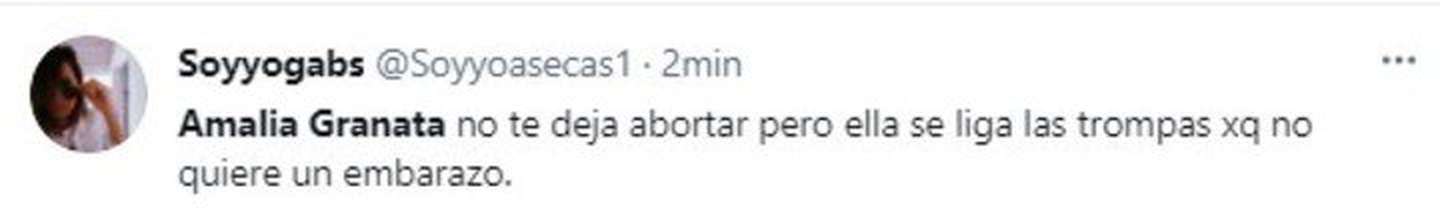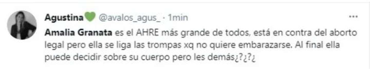 “Amalia Granata no te deja abortar, pero ella se liga las trompas porque no quiere un embarazo”, cuestionó una. Mientras otra hizo hincapié en su declaración sobre la adopción: “La diputada provida diciendo que no adoptaría un nene porque no tiene tiempo, pero sí puede obligar a parir a otras madres en diferentes situaciones”.