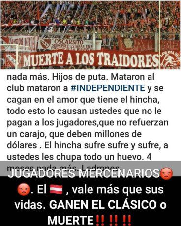 Las amenazas circularon por distintas redes sociales y en una de ellas se puede ver una foto de la bandera de la hinchada de Independiente: "Muerte a los traidores", acompañado de un texto que dice: "Hijos de P…. Mataron al club, mataron a Independiente".