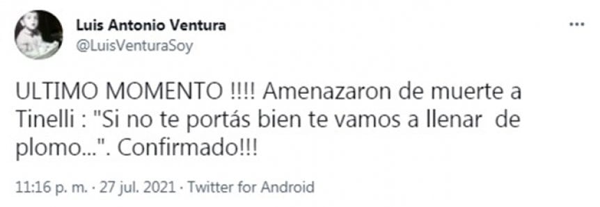 El violento mensaje de Whatsapp decía: "Si no te portás bien, te vamos a llenar de plomo…". La información fue publicada pasadas las 11 de la noche por el periodista de espectáculos y director técnico Luis Ventura, a través de las redes sociales, justo cuando Tinelli estaba conduciendo un nuevo programa de ShowMatch. Lo que no se sabe a esta altura es si la amenaza fue judicializada o no.
