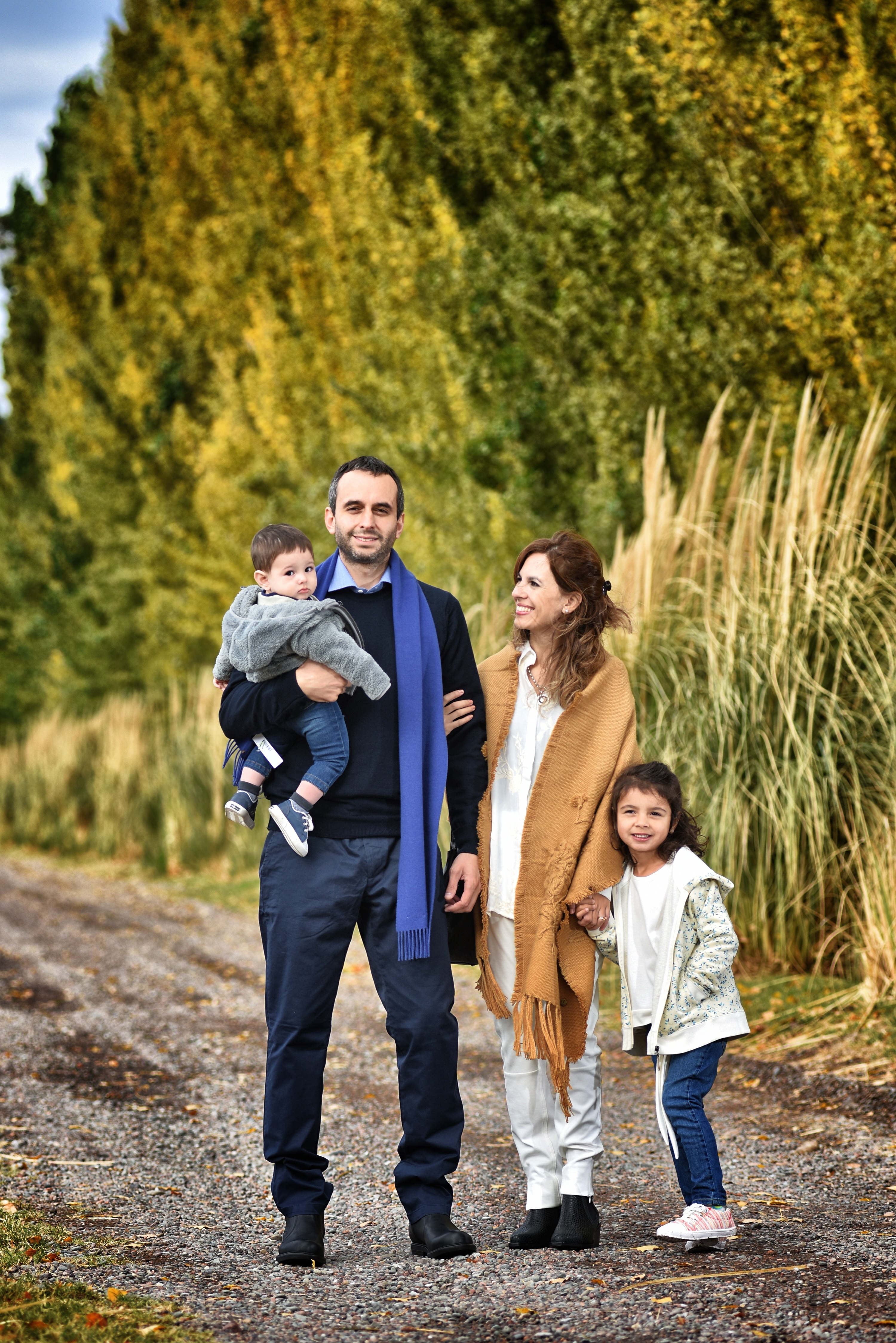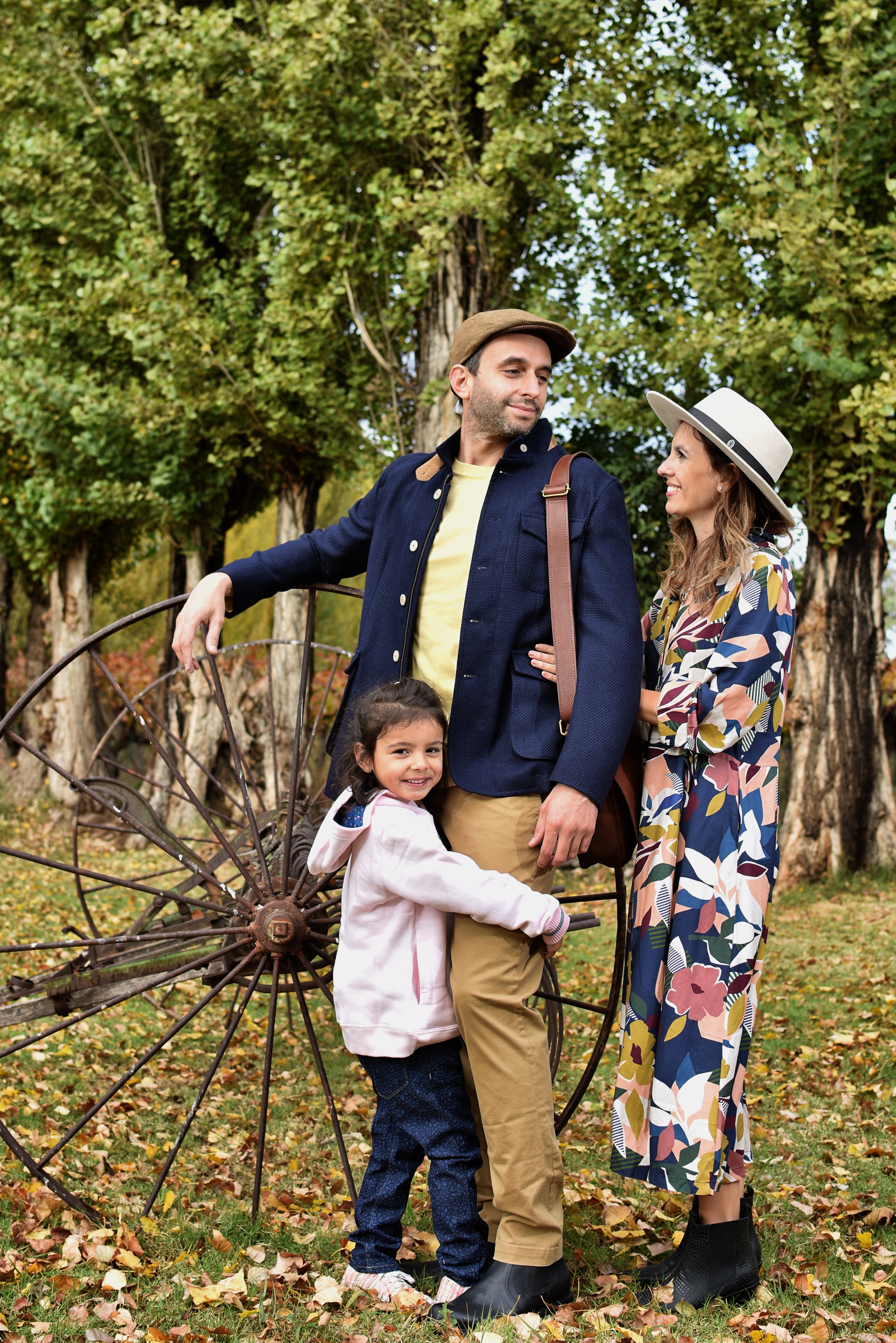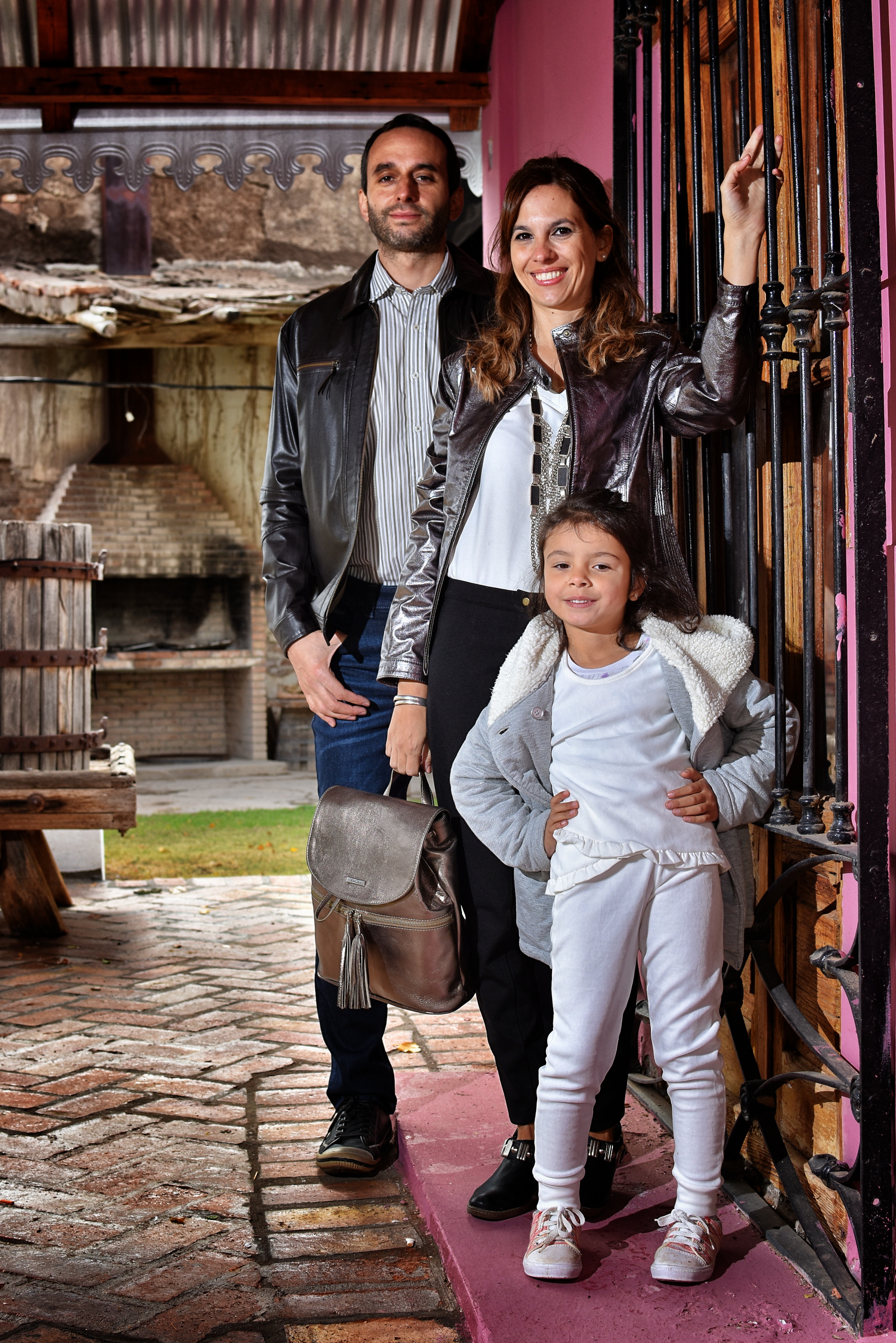 Familieros. Alejo con sus papás Diego (vestido con pantalón de gabardina azul -$4.558-, camisa corte italiano en algodón -$3.990-, sweater de lana escote redondo en azul -$4.800- y bufanda de lana al tono -$2.490- más botinetas de cuero -$4.610-) y Flavia (vestida con breech color crudo con terminación de cierres cada pierna -$4.500-, camisa color crudo en crepé con bordados al tono -$3.790- y chal de lana bordado en color camel -$6.900- y botineta de cuero -$6.500-). María Paz con buzo color crudo con detalle de nudo a la cintura ($1.060), chupín de jean bordado ($1.900) y campera con capucha estampada (desde $985).