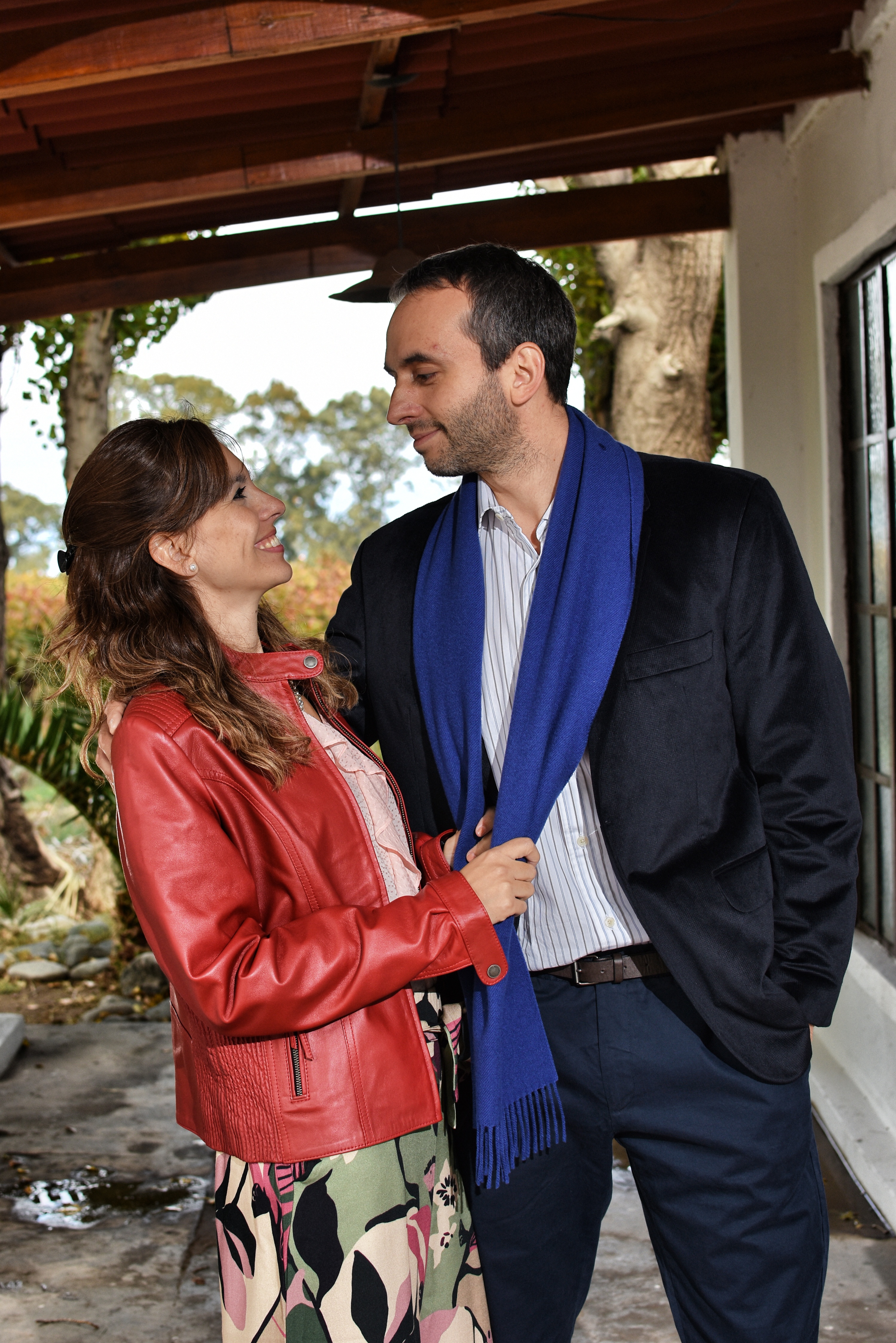 Gratitud y elegancia. Flavia vestida con camisa color rosa con vuelo desde el hombro a la cintura ($2.920), chaqueta de cuero de oveja color rojo y costuras en los hombros ($21.870) y pantalón tipo palazzo estampado ($6300). Diego con camisa a rayas en celeste y beige corte italiano ($2.790), saco símil pana ($6.980), bufanda de lana ($2.490) y pantalón de gabardina ($4.558).