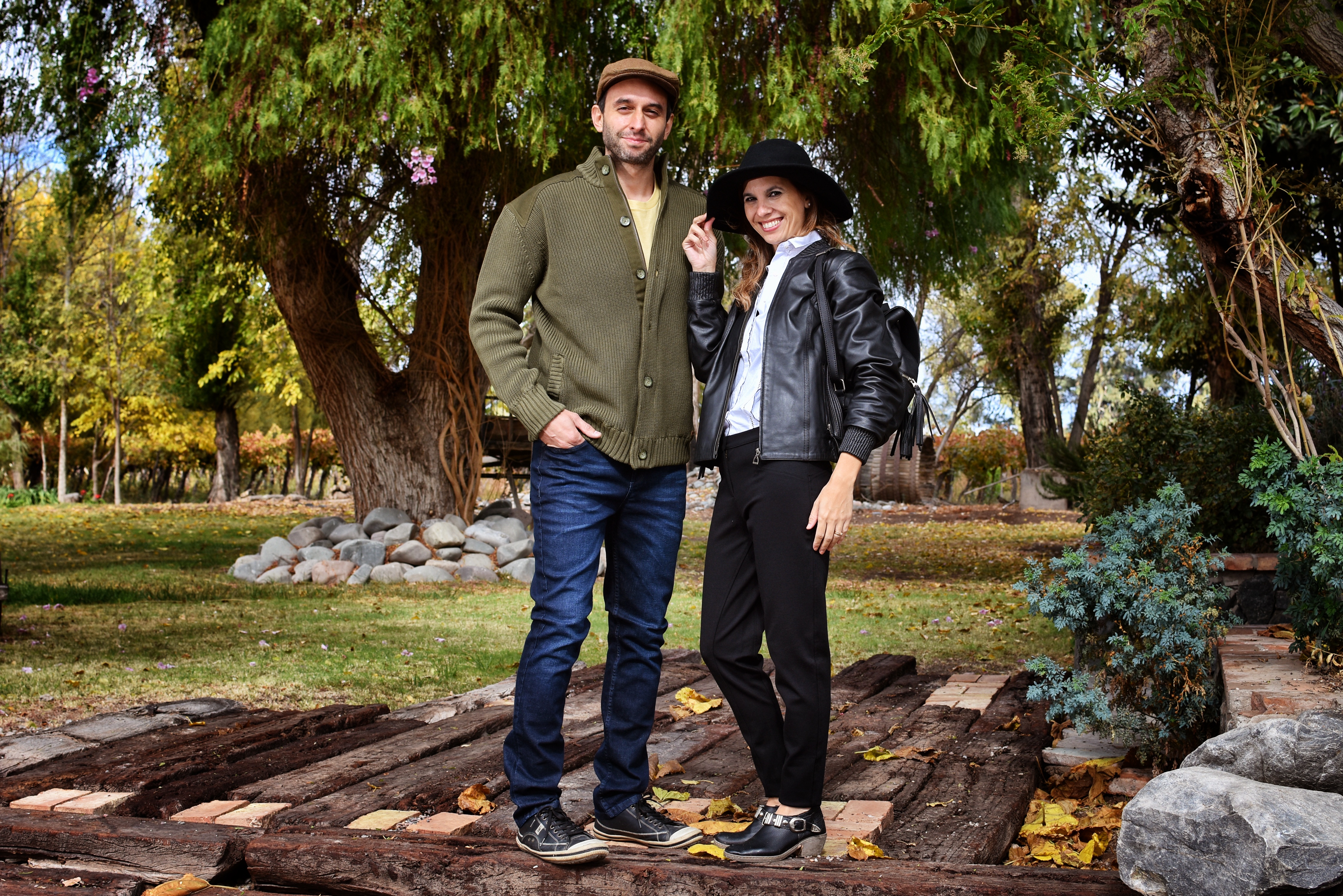 Unidos. Ella con camisa estampada de viscosa ($4.150), breech negro ($3.070) y chaqueta de cuero de vaca color chocolate, con cuello mao y matelasé en las mangas ($15.400). Como detalles chambergo color caramelo ($3.320) y cartera de cuero de vaca, color suela, con correa en negro y herrajes ($5.950). Él con camisa en poplin en rojo y blanco ($2.650), sweater escote redondo en algodón ($3.400) y campera de cuero vacuno fulonado color chocolate (14.870) combinada con jean añejo ($3975).