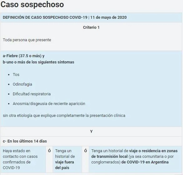 Estos se suman a los anteriores criterios que consideraban caso sospechoso a toda persona que presente "fiebre 37,5 o más, o tener alguno de los siguientes síntomas: tos, odinofagia, dificultad respiratoria, anosmia/disgeusia de reciente aparición (pérdida de olfato y gusto) sin otra etiología que explique completamente la presentación clínica", informaron desde la página web de argentina.gob.ar.
