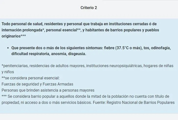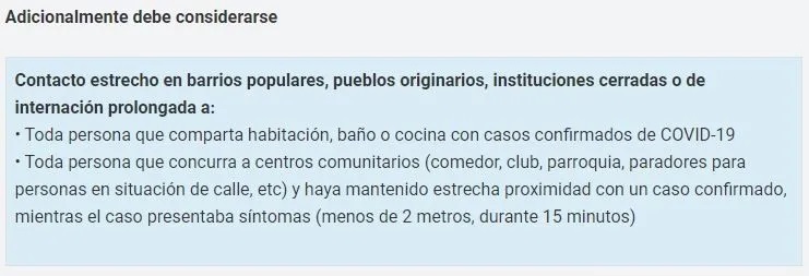 "El contacto estrecho en barrios populares, pueblos originarios, instituciones cerradas o de internación prolongada a toda persona que comparta habitación, baño o cocina con casos confirmados de COVID-19" y a "toda persona que concurra a centros comunitarios (comedor, club, parroquia, paradores para personas en situación de calle, etc) y haya mantenido estrecha proximidad con un caso confirmado, mientras el caso presentaba síntomas (menos de 2 metros, durante 15 minutos)", forman parte de los nuevos criterios para determinar si un caso es sospechoso del virus.