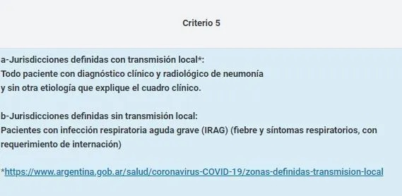 La cartera de Salud agregó que la definición de caso sospechoso de coronavirus abarca a "las jurisdicciones definidas con transmisión local -todo paciente con diagnóstico clínico y radiológico de neumonía y sin otra etiología que explique el cuadro clínico- y las jurisdicciones definidas sin transmisión local -pacientes con infección respiratoria aguda grave (IRAG), fiebre y síntomas respiratorios, con requerimiento de internación-".