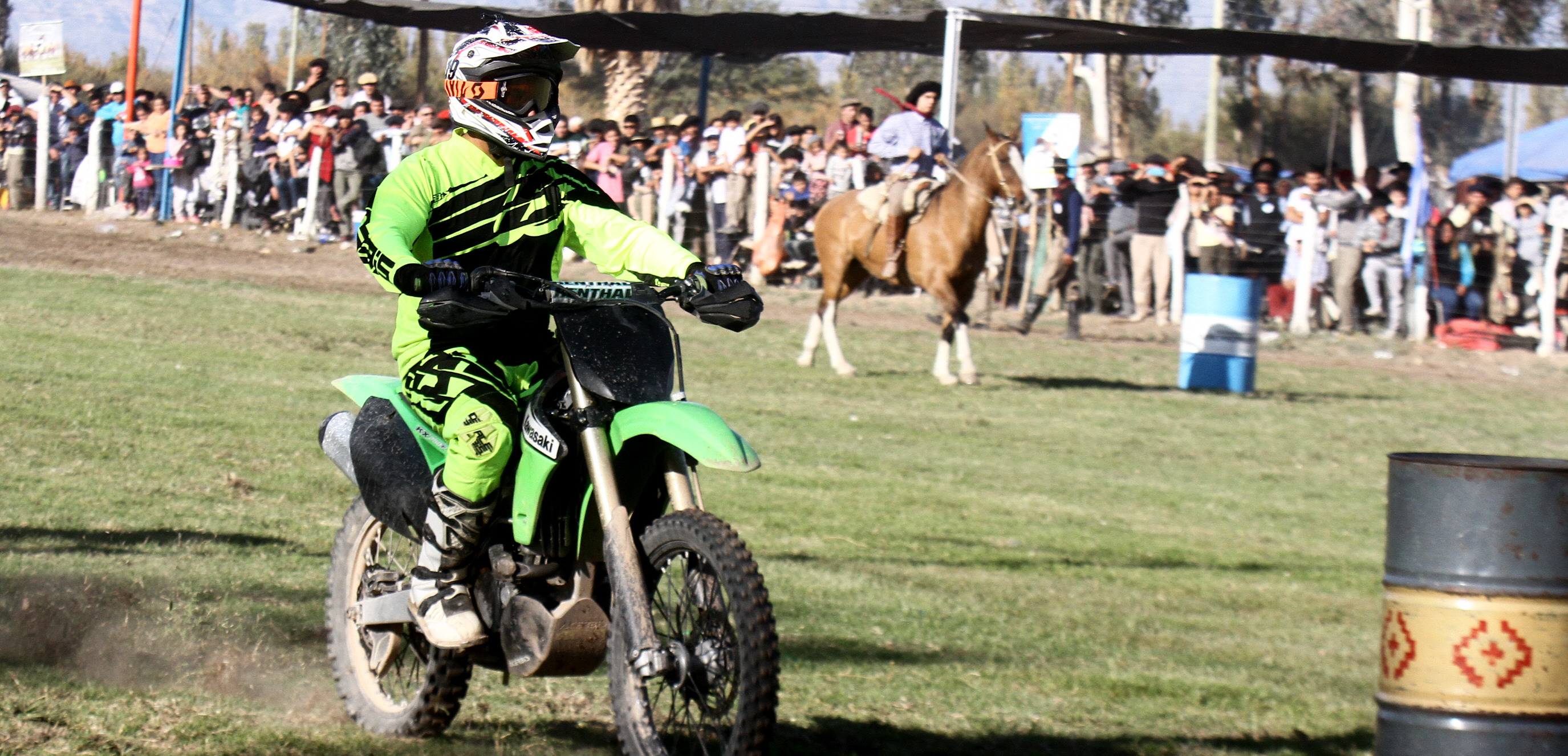Que la moto es una Kawasaki 250cc, de motocross e ideal para distancias cortas. Que el caballo es más ágil y gana en lo trabado. Las especulaciones entre el público y los diferentes puntos de vista iban y venían a medida que crecía la expectativa entre los 5.000 asistentes a la 25ta edición de la Fiesta Provincial Día del Trabajador, el tradicional festival gaucho de Angaco que tuvo una particular exhibición: el duelo entre un caballo y una moto. Y salió una carrera entre palenques y tambores que duró menos de 40 segundos, cautivando a todos los presentes por lo electrizante de la propuesta. ¿Quién ganó? No hubo sorpresas y la picardía gaucha hizo de las suyas porque el caballo era fija y venció con contundencia.