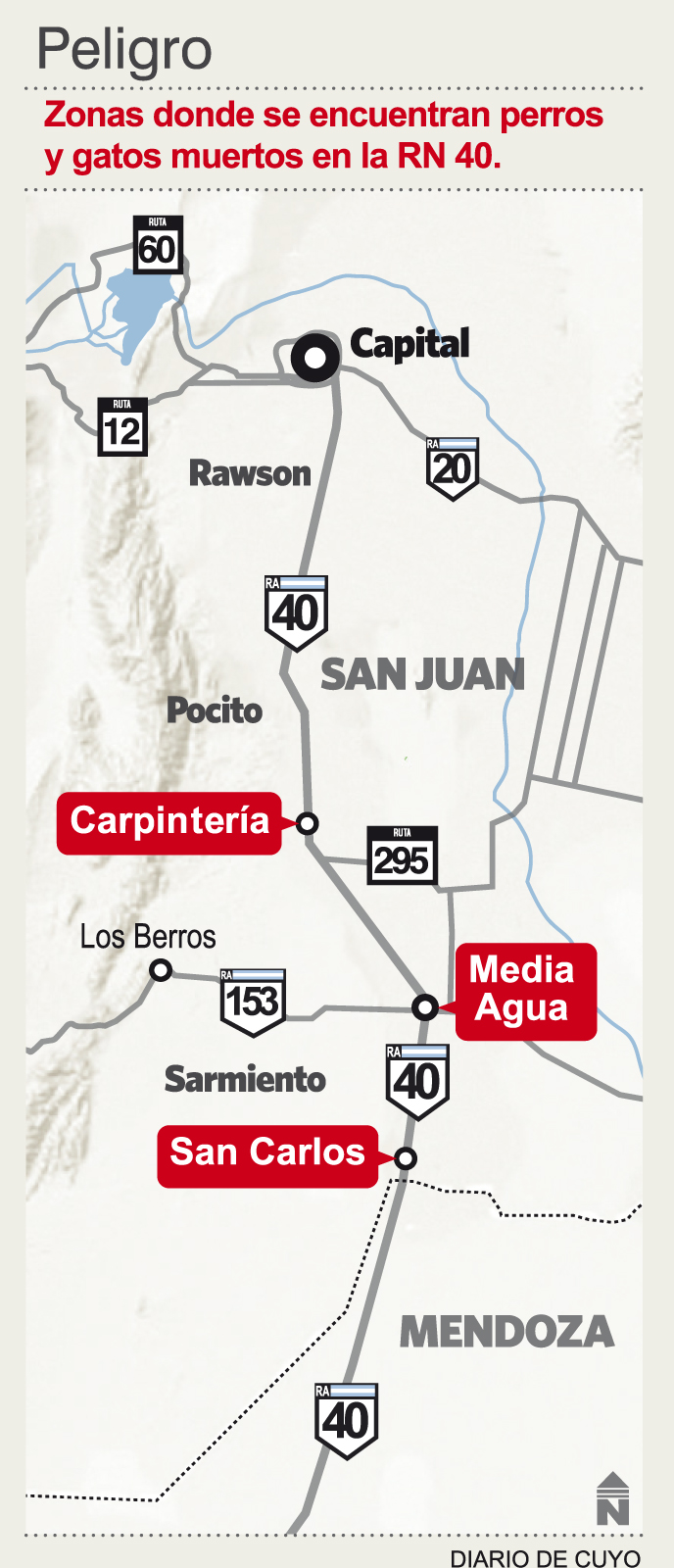 En la Ruta Nacional Nº 40 desde Capital hasta el límite con Mendoza se pueden ver muchas cosas. Desde máquinas viales trabajando, como sanjuaninos que venden sus sandías y melones en puestos al costado del camino. Pero también animales muertos, en especial perros y gatos. No pude contabilizarlos. No es que sea una gran cantidad. De todos modos, forman parte de un peligro para los vehículos que transitan a cierta velocidad y que podrían promover un accidente, con serias consecuencias. Sería necesario que las autoridades correspondientes hicieran llegar a los vecinos que viven a lo largo de esta ruta, algún tipo de comunicado para que no permitan a sus animales domésticos salir a esta vía. La probabilidad de accidentes son muchas y el riesgo de vida también. Si colaboramos entre todos vamos a salvar vidas en el tránsito.