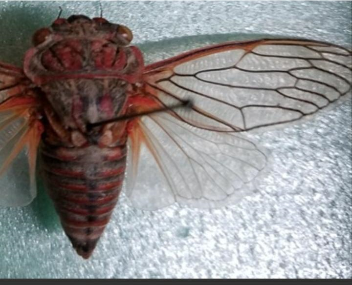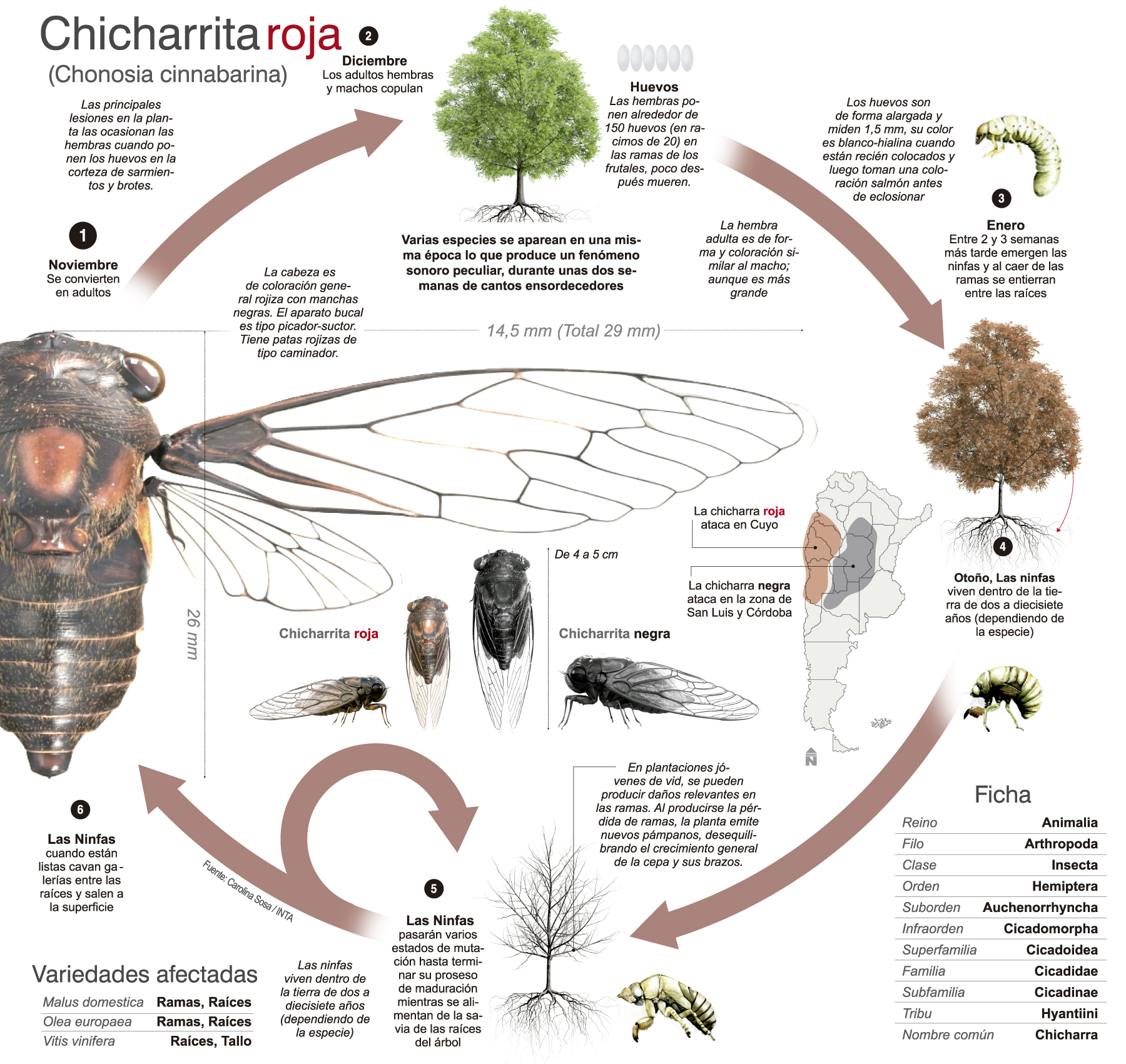 Por ello contactamos a Carolina Sosa, ingeniera agrónoma del INTA EEA San Juan, quien comenzó diciendo a este medio "la especie que tenemos acá en la zona cuyana, es la chicharra roja, llamada Chonosiacinnabarina, que es un hemíptero de la familia de los Cicádidos, el adulto tiene 2 a 3 centímetros, desde la cabeza hasta la punta del abdomen, es de coloración rojiza, con algunos tintes grises oscuros a negros. La hembra siempre es más grande que el macho en tamaño, es el dimorfismo sexual que poseen".