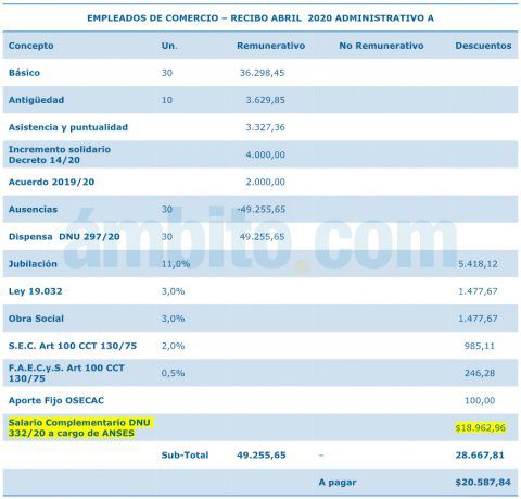 Por ello, expondremos cómo sería la liquidación correspondiente al mes de abril 2020, tomando como ejemplo a los Empleados de Comercio CCT 130/75.
