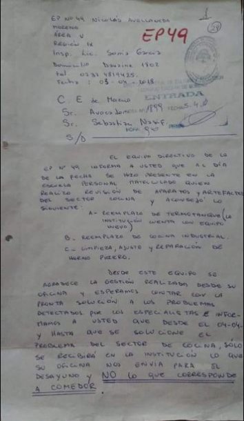 En la misiva, escribe que el gasista recomendó una serie de cambios a realizar en la cocina y que hasta que no se realicen, no se iba a utilizar las instalaciones del lugar.