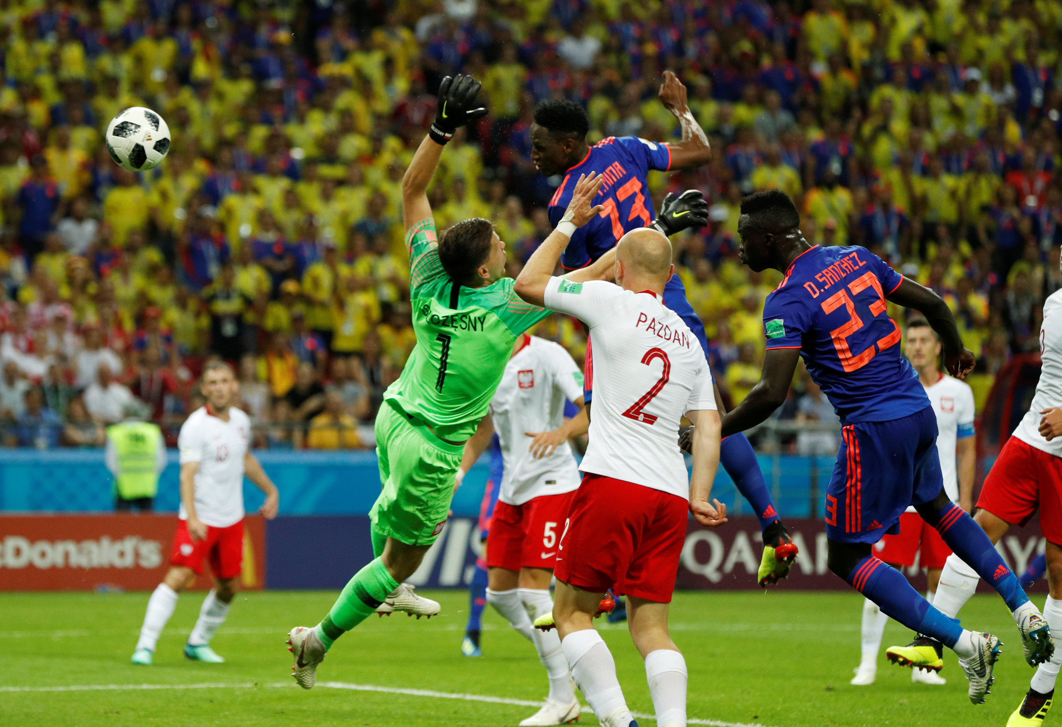 Comenzó mejor Polonia, con pases largos hacia Robert Lewandowski y se aproximó con cierto peligro al área de David Ospina. Pasado el asedio inicial Colombia respondió a través del manejo de James Rodríguez y Juan Fernando Quinteros y con mayor tenencia de pelota. El desarrollo se hizo parejo, con pocas situaciones de gol frente a los arcos. Hasta que, a los 40 minutos, un centro de James desde la izquierda fue anticipado de cabeza por Mina ante la salida de Szczesny para abrir el marcador.