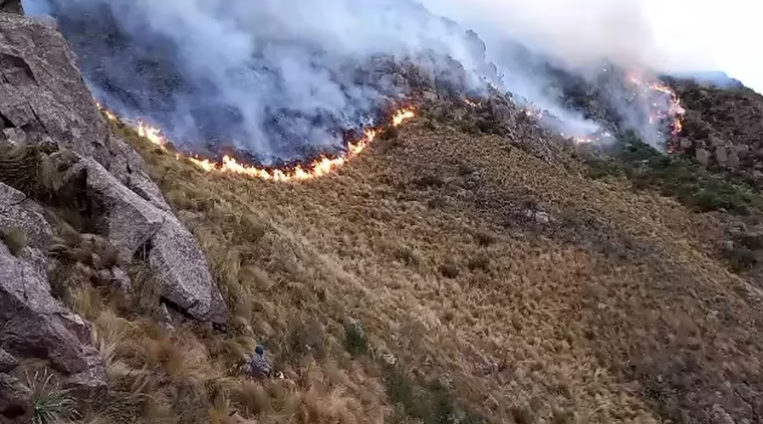 “Son dos helicópteros y tres aviones los que están combatiendo arriba de la montaña. El foco de incendio se ubica en una quebrada de muy difícil acceso, a gran altura, en donde hay mucho pajonal y por eso aún no se sofocó, no hay pronóstico de lluvia, no hay viento, hace frío y hay humedad, eso es favorable”, indicó Alexis Silvio Ochoa, segundo jefe de Bomberos, en declaraciones a TN. Y agregó: “Pero aumentarán las temperaturas durante este último fin de semana, por ende tenemos que liquidarlo en estos días”.