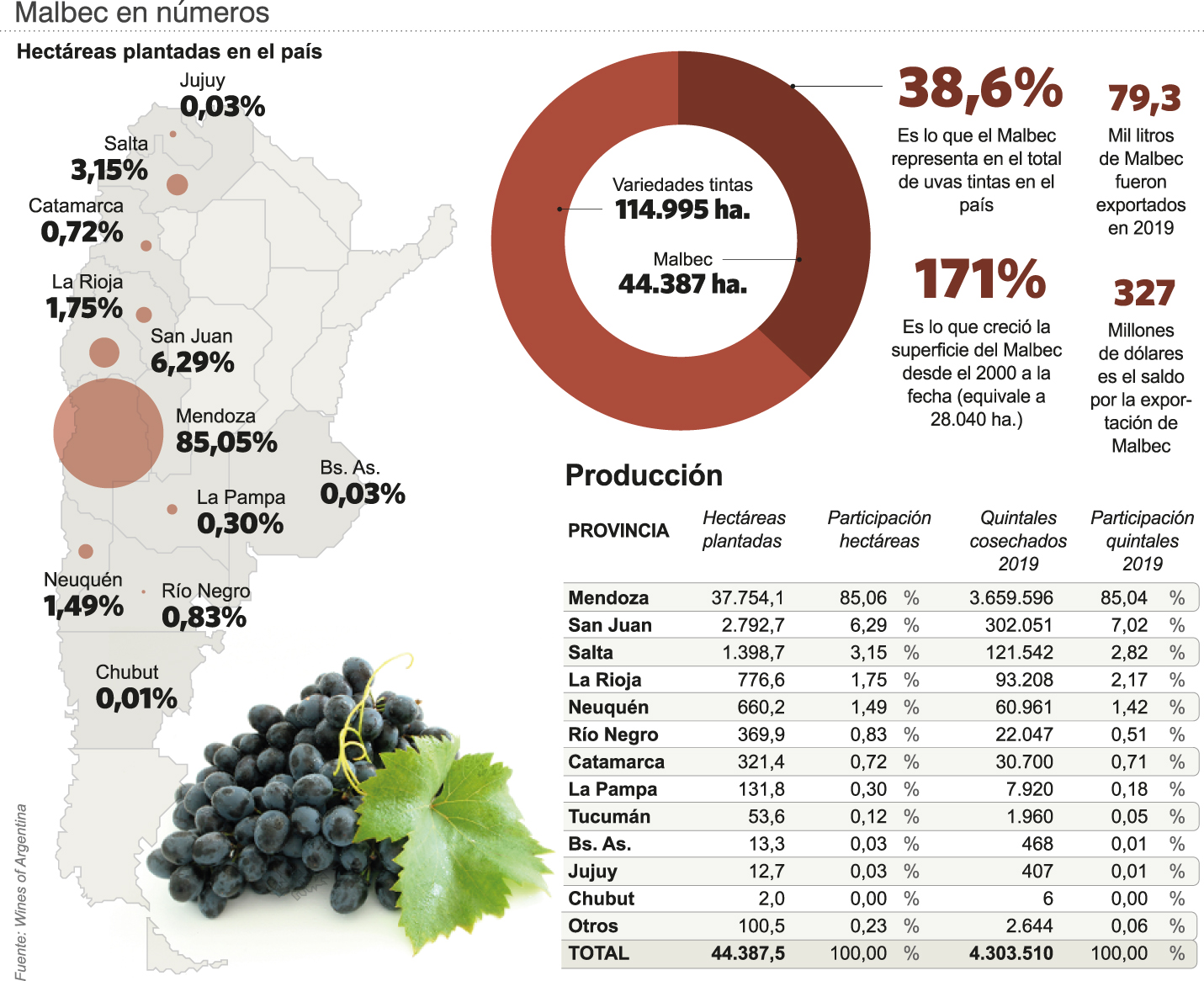 Con más de 44.000 hectáreas plantadas en el territorio nacional, el Malbec representa el 38,6% de las variedades tintas y el 22,39% de la superficie total cultivada en el país, convirtiéndose en la variedad más extendida desde el año 2011 y la que más ha aumentado su superficie en los últimos 19 años. De 16.347 has. en el año 2000 la superficie de Malbec registró un incremento del 171%, el equivalente a 28.040 has.