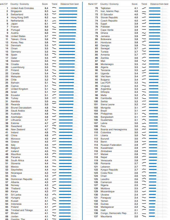 La tendencia de Argentina indica que se fue mejorando en el último tiempo hasta llegar a ubicarse en el puesto 96 con una calificación de 3,3. Al ranking lo lidera Emiratos Árabes (6,4 puntos) seguido por Singapur (6,3) y Suiza (6,3).