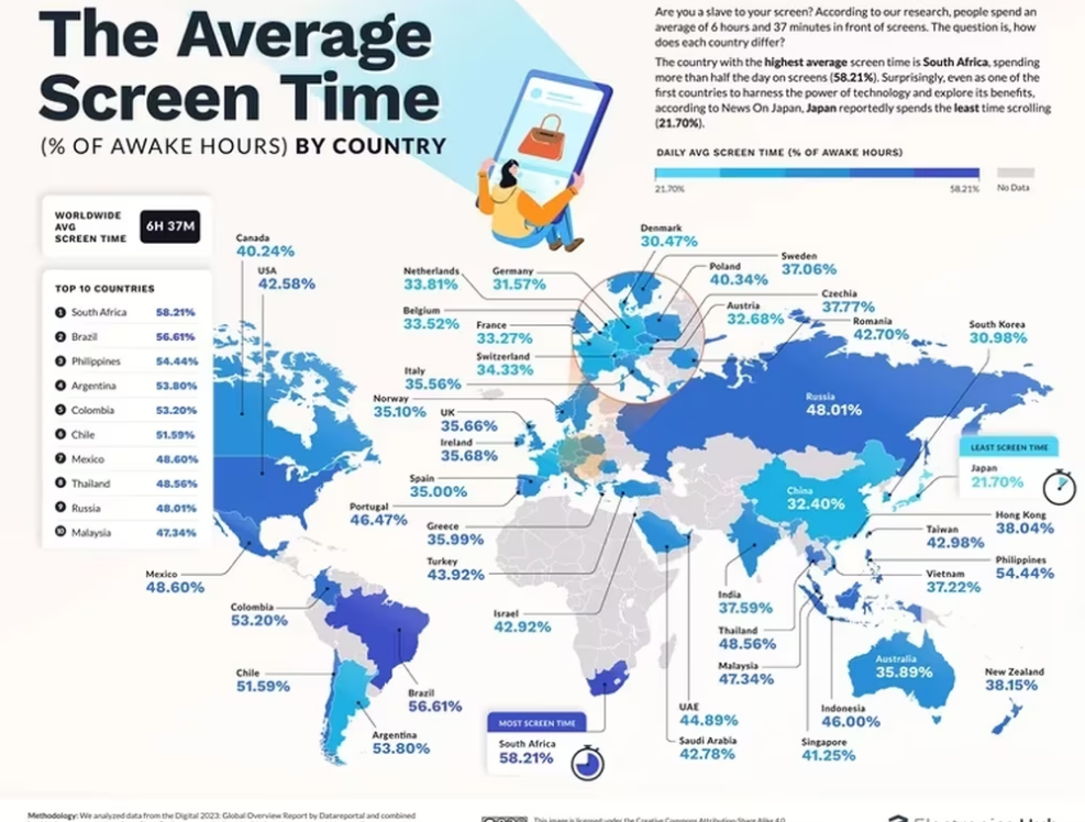 En el ranking, Sudáfrica ocupa el primer puesto en la lista, porque el estudio considera que cada persona gasta 58.2% en promedio del tiempo al día, lo que también representa tres quintos del tiempo de una persona despierta, según indica Infobae.