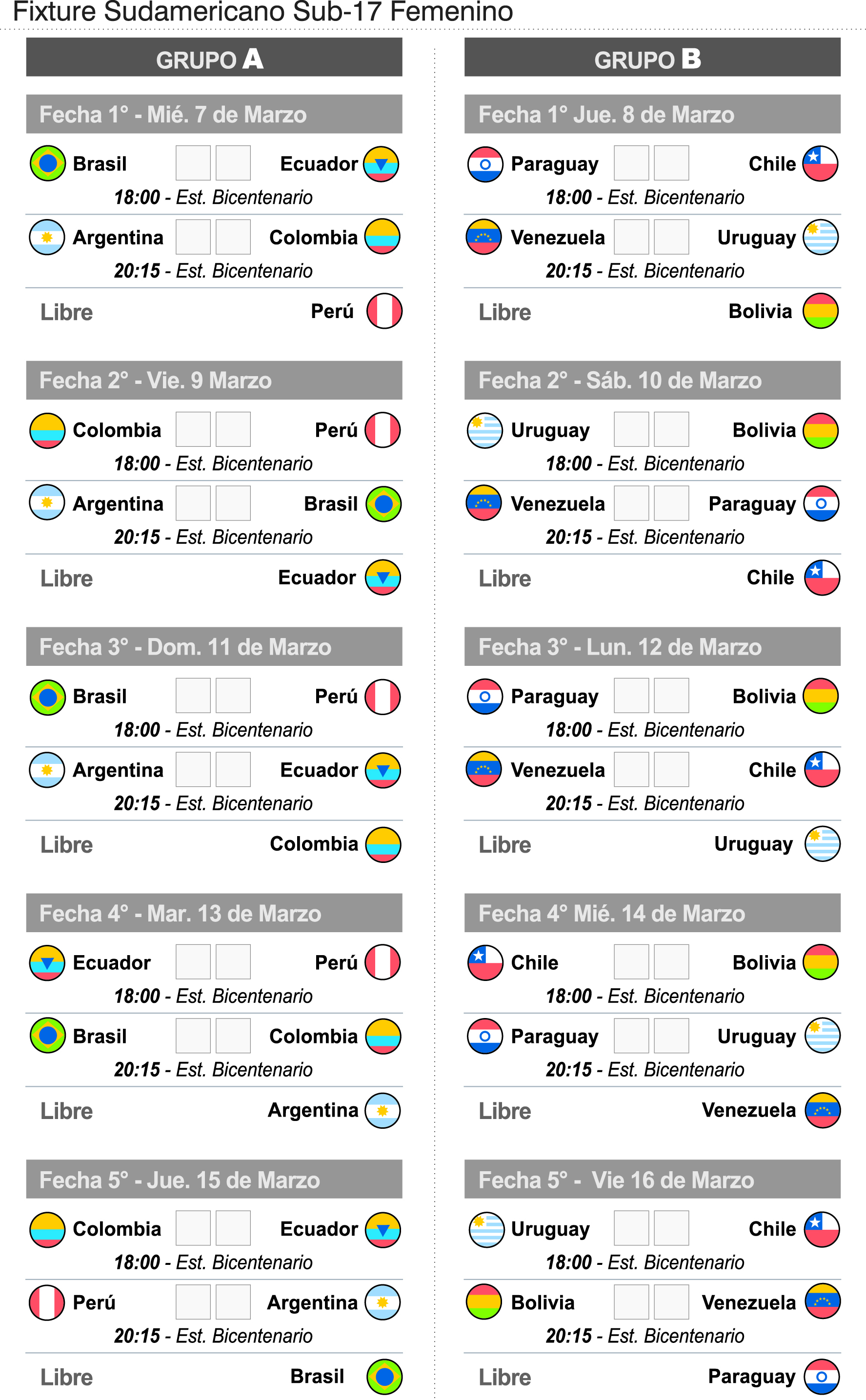 Se terminó la cuenta regresiva para las chicas. El Campeonato Sudamericano de fútbol femenino en categoría Sub-17 que tiene como sede San Juan comienza hoy. La selección argentina tendrá su debut a las 20.15 horas cuando se enfrente a Colombia, buscando dar el primer paso de la mejor manera. Argentina integra el Grupo “A” junto a Brasil, Colombia, Ecuador y Perú. En tanto el Grupo “B” está integrado por el bicampeón Venezuela junto a Paraguay, Uruguay, Chile y Bolivia. Cabe destacar que la entrada es libre y gratuita durante todo el torneo.