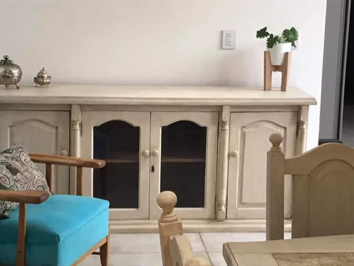 La gente hoy se deja llevar mucho por internet para seleccionar lo que quiere en cuanto a gustos, pero por lo general lo que más piden es el decapado en blanco. Decapado significa levantar capas, es decir un mueble que está marrón lustrado o pintado, se pinta con un marrón africano y arriba se le da pintura blanca, se va parafinando entre mano y mano y después se levanta con lija y van saliendo las capas y queda algo de marrón a la vista. Entonces el aspecto es envejecido, decapado, gastado, es el paso del tiempo en esa pieza. Esto se utiliza mucho, porque de repente el blanco lo integras a un ambiente más moderno o minimalista, pero con el decapado se le da un toque especial.