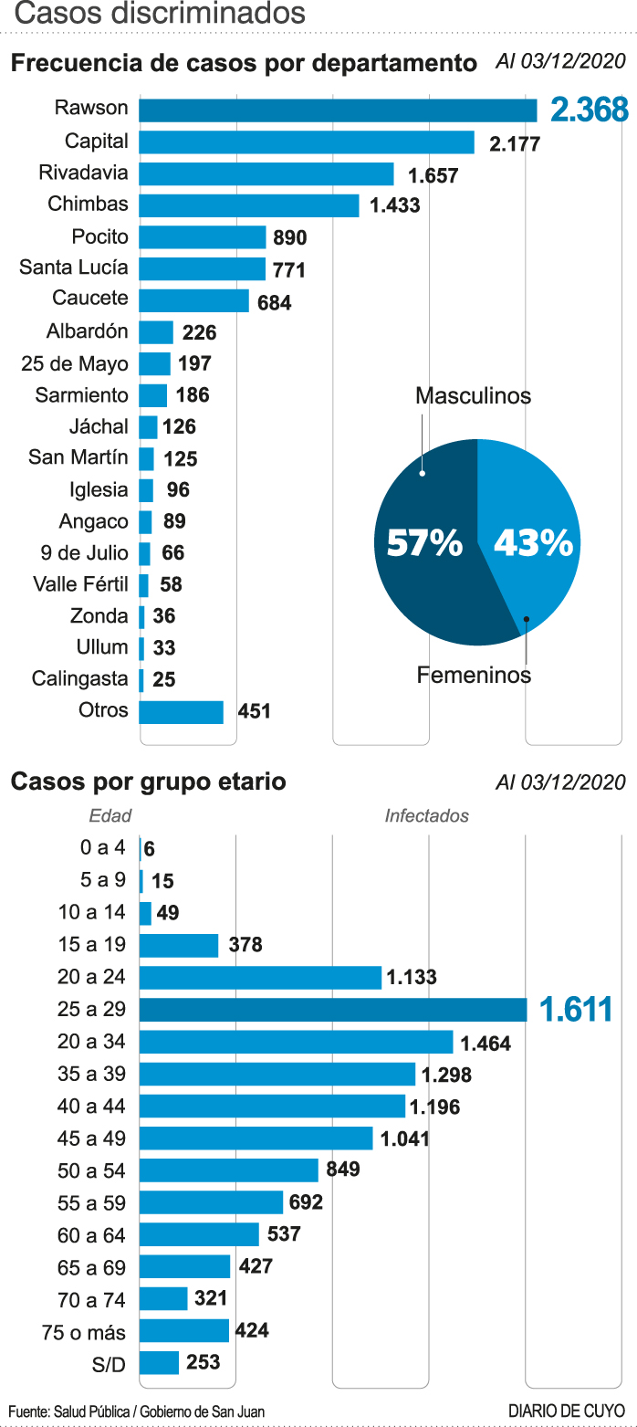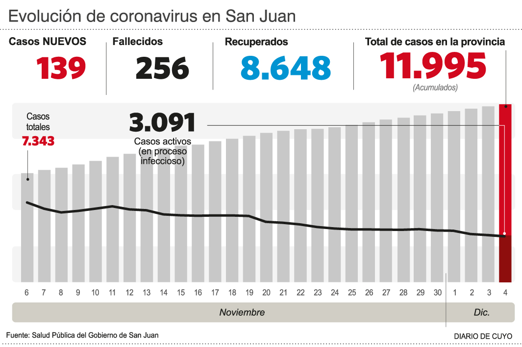 En cuanto al parte diario, ayer fueron reportados cuatro fallecimientos (ver aparte) y 156 nuevos casos, para superar la barrera de los 12.000. Y es que ahora San Juan acumula 12.151 positivos, de los cuales 3.150 son personas que están atravesando procesos infecciosos. Los recuperados, en tanto, siguen creciendo y hasta ayer totalizaban 8.741 personas.