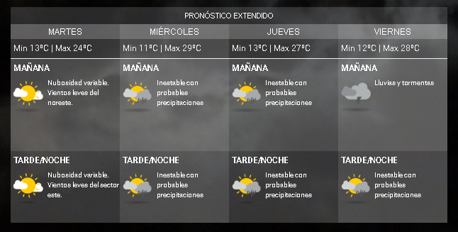 El miércoles estará inestable con probables precipitaciones y una máxima de 29ºC. Para el jueves y viernes, la probabilidad de lluvias continuará y las máximas oscilarán entre los 27 y 28 grados.