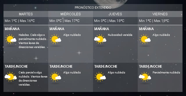 Se espera para este martes 31, heladas y vientos de direcciones variables, según el pronóstico del Servicio Meteorológico Nacional. Si bien las temperaturas bajas no cesan, prevén que pasado el mediodía la máxima ascienda a los 16ºC y ayude a soportar el frío.