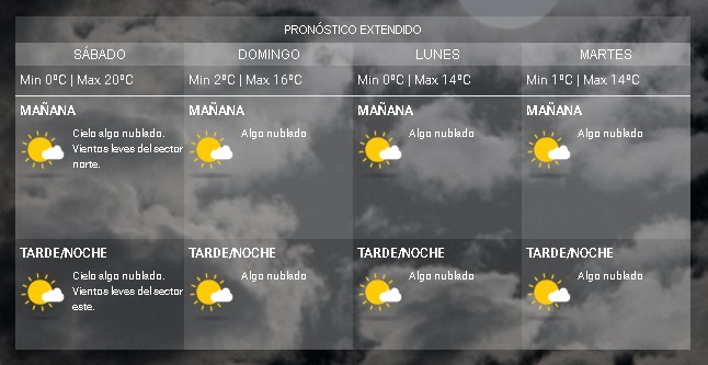 Para este sábado se espera que la máxima llegue a los 22ºC mientras que la mínima marcará 0ºC, según la página digital del Servicio Meteorológico Nacional.