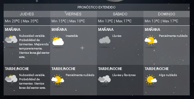 Para el viernes, la máxima será de 18ºC mientras que para el fin de semana se espera que llegue a los 17ºC. Se espera tiempo inestable con lluvias para los próximos días.