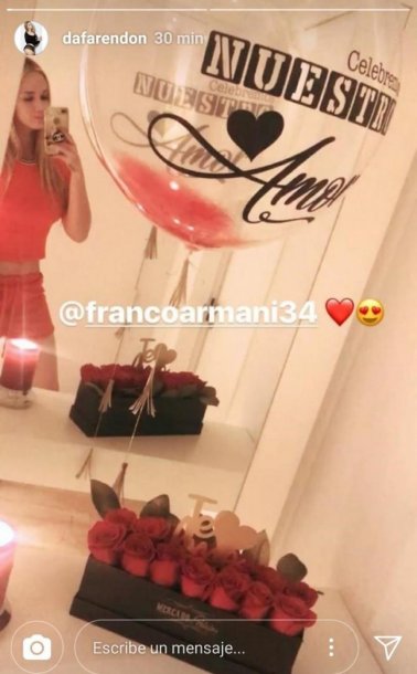 En las últimas horas, la modelo publicó una foto mostrando el regalo que el arquero le hizo para celebrar su amor. "Llegar a casa y encontrar esta belleza", escribió, mostrando el tierno obsequio: una caja llena de rosas rojas adornada por un globo con un amoroso mensaje.