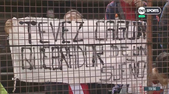 "Tevez cagón quebrador de un sueño", fue una de las banderas que aparecieron en la tribuna antes de que empezara el partido.