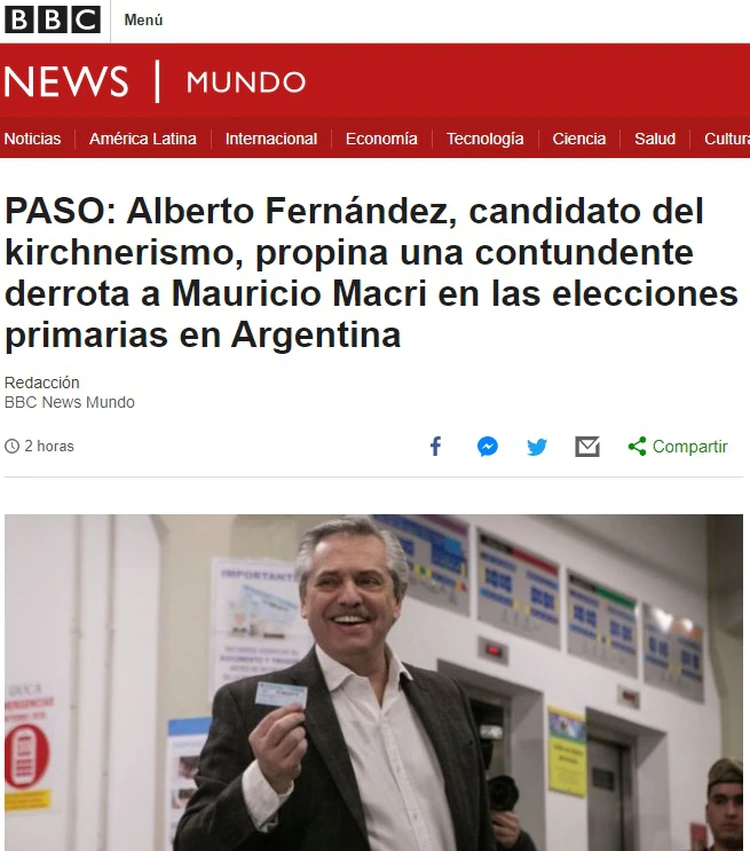 "El candidato del kirchnerismo le propina una contundente derrota a Mauricio Macri", titula la BBC en su edición internacional es español.