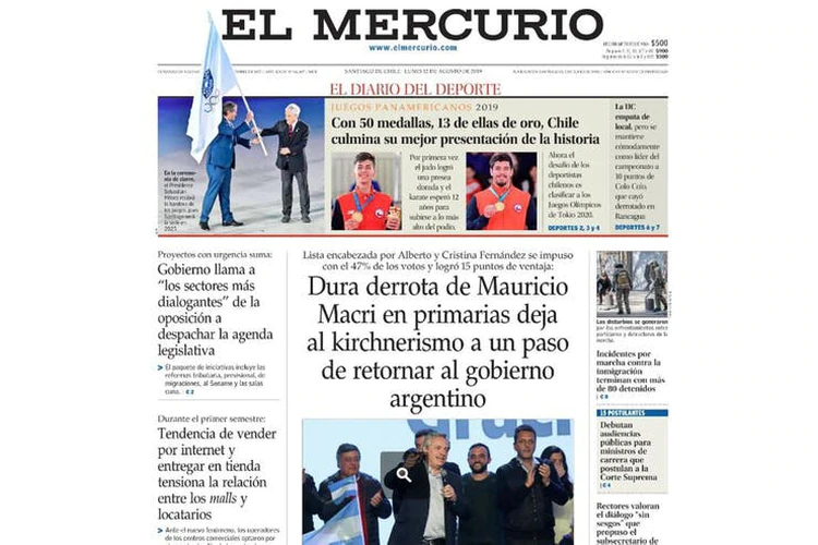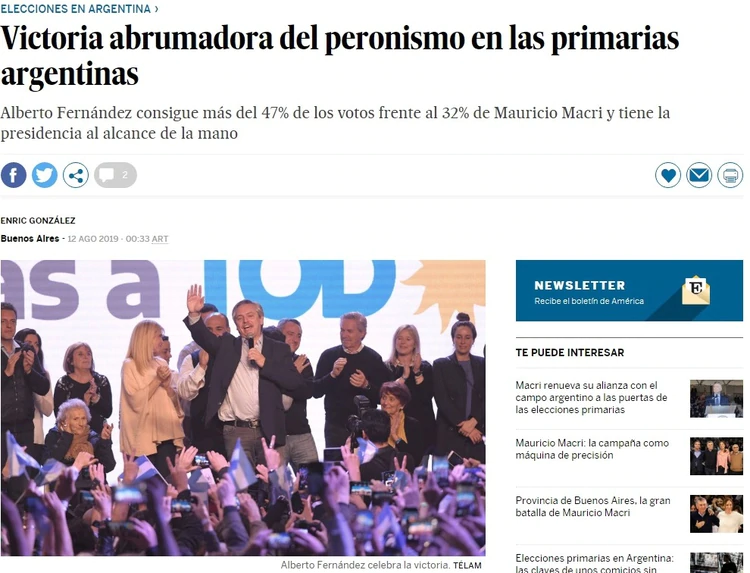 El diario El País de España habla de "contundente victoria del peronismo". El periódico español escribe que Fernández y su compañera de formula, la ex presidenta Cristina Fernández de Kirchner, "parten como clarísimos favoritos para la elección de octubre. Tienen la victoria al alcance de la mano".