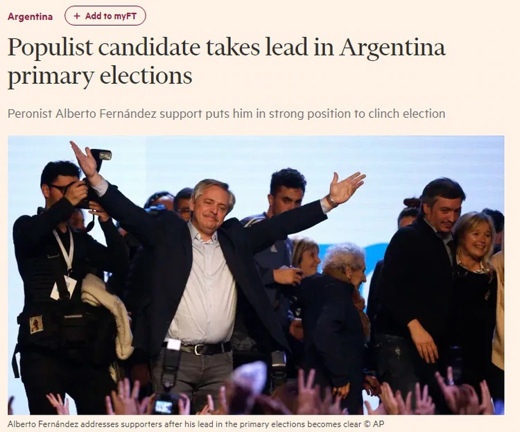 El Financial Times, el más reputado e influyente diario económico del mundo, escribe que "los temores de un regreso del populismo se intensificaron en Argentina" tras la victoria de Alberto Fernández por un margen más amplio del esperado.