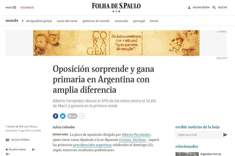 El diario brasileño destaca que "si los números se repetirán en la elección general Fernández sería electo en primera vuelta".