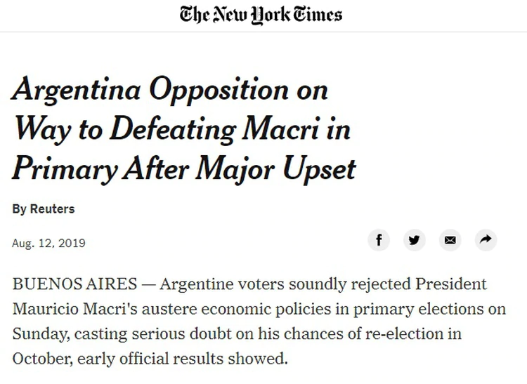 El diario neoyorquino reproduce un cable de la agencia Reuters. En la nota se lee que en estas primarias los argentinos "rechazaron rotundamente las austeras políticas económicas del presidente Mauricio Macri".