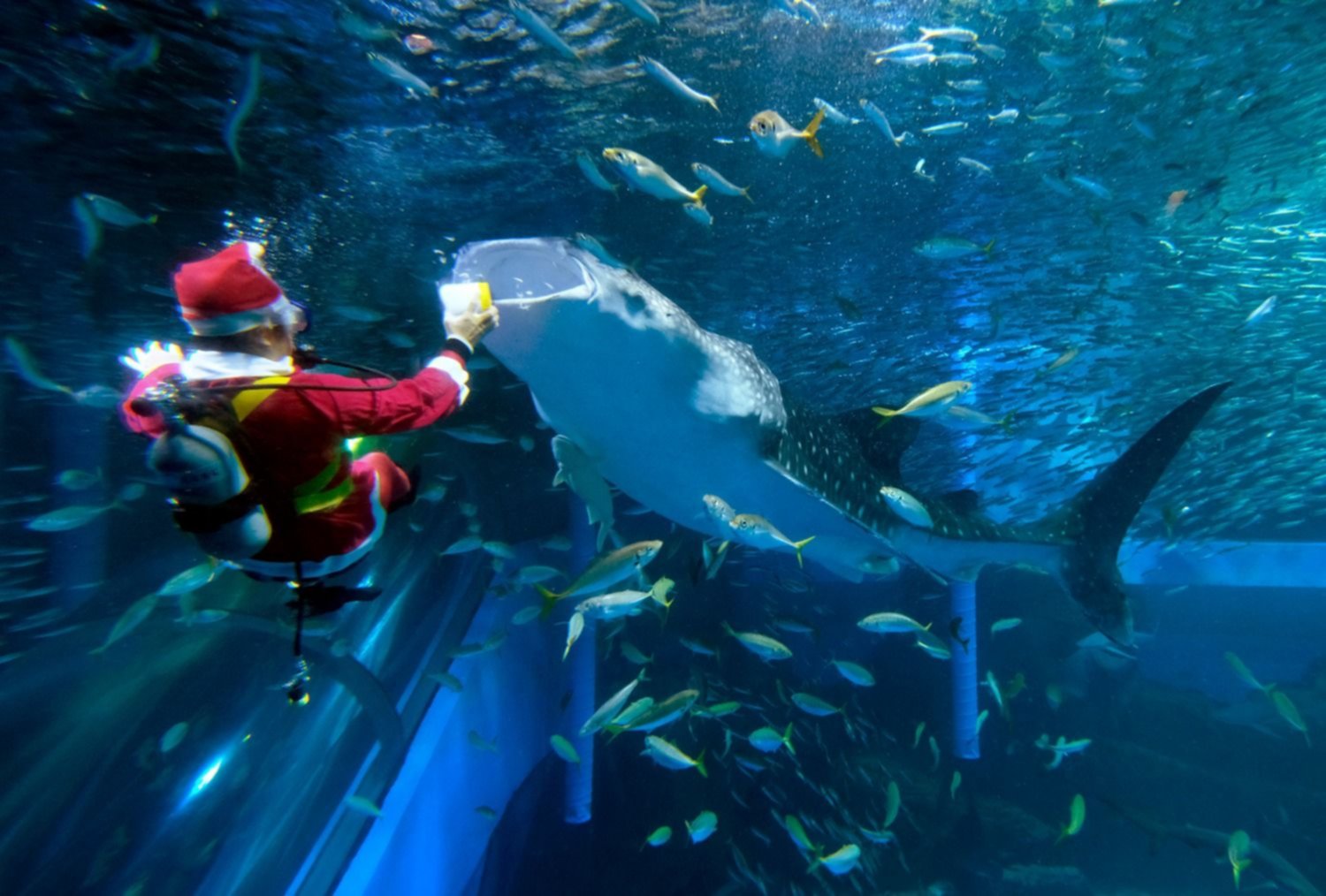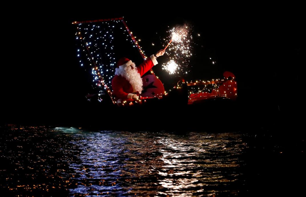 Un hombre vestido de Papá Noel sostiene una bengala, sentado en una embarcación en Imperia, Italia.