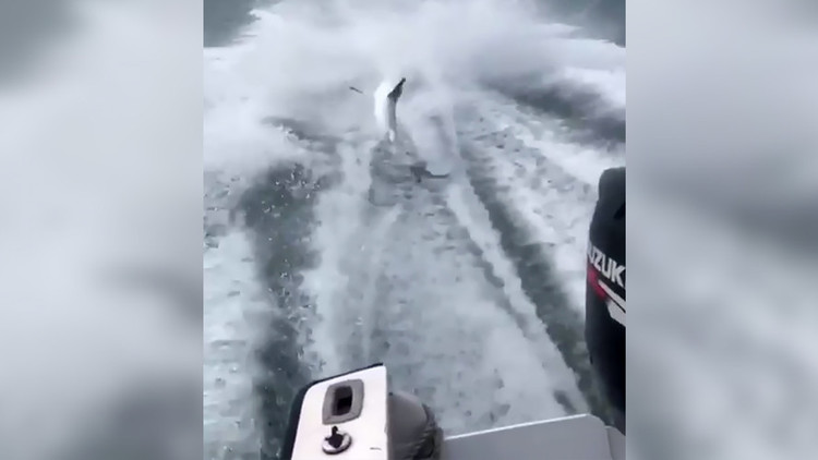 La grabación muestra al pez atado a la lancha por la cola, agitándose en el agua mientras es arrastrado por el mar. Al mismo tiempo, se puede ver a tres hombres riéndose. "Mira, ya está casi muerto", comenta uno de ellos.