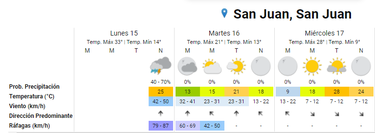 El pronóstico de viento con gran intensidad en el Gran San Juan comenzó a palparse desde las 20,30 y las ráfagas podrán alcanzar hasta los 90 kilómteros por hora, según publicó el Servicio Meteorológico Nacional (SMN).