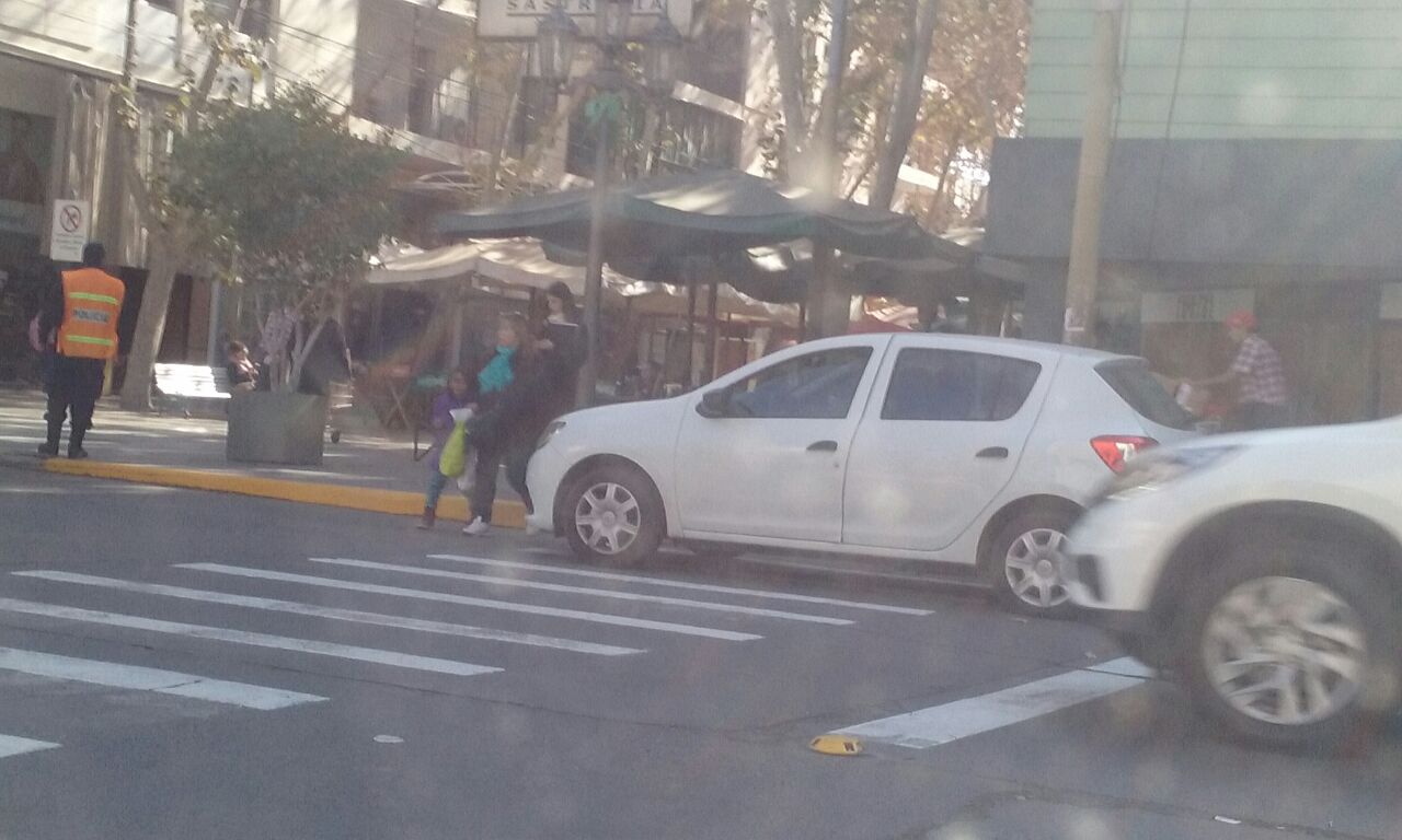 Un lector envió una imagen y el siguiente comentario: "Esto pasó hoy sábado en pleno centro. El auto blanco estuvo estacionado casi 5 minutos en la senda peatonal y el policía no hizo nada".