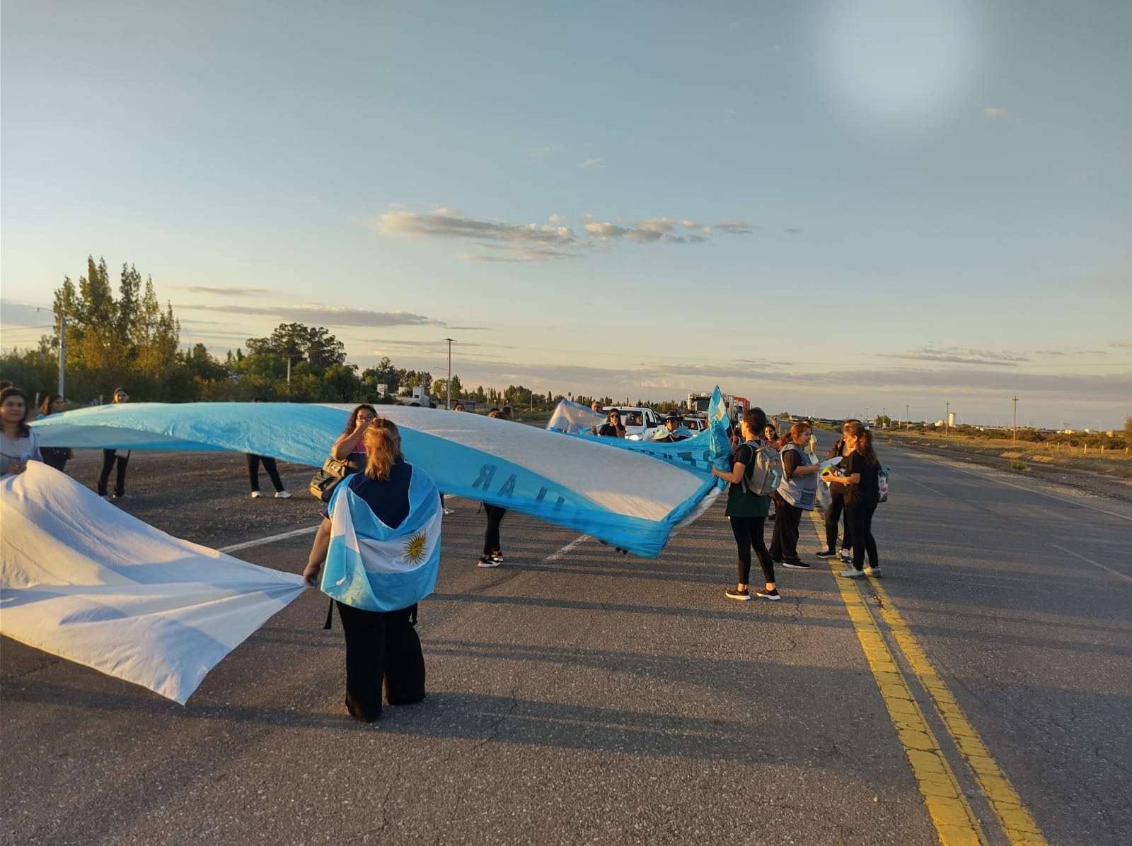 Los docentes llegaron con banderas y se apostaron debajo del arco de acceso impidiendo la circulación, tanto para entrar como para salir, del departamento. Es la segunda manifestación de este tipo que realizan en aquella comuna.