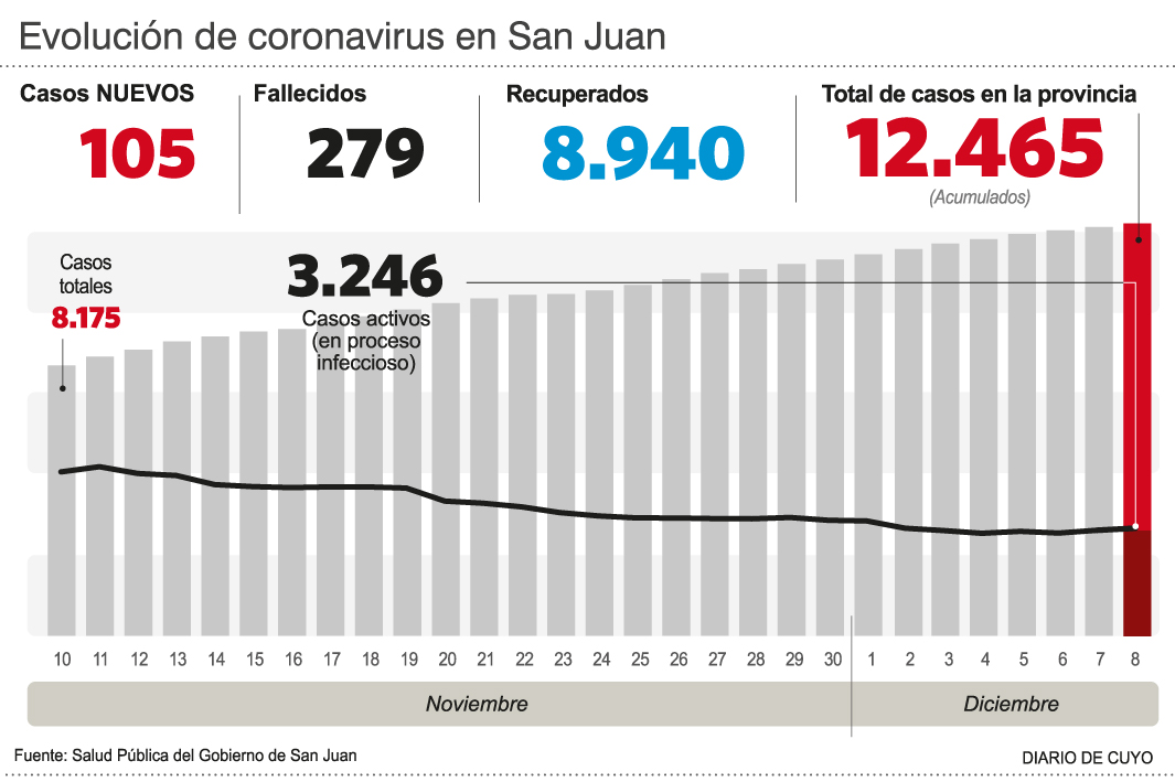 Luego de dos días consecutivos con 6 fallecimientos registrados oficialmente por Covid-19 en San Juan, ayer la cifra de elevó a 7, igualando así la máxima alcanzada ahora durante varias jornadas desde que inició la pandemia. Los fallecidos que informó ayer Salud son cuatro hombres de 75, 77, 90 y 95 años, y tres mujeres de 50, 58 y 75 años. Al mismo tiempo, ayer permanecían internados 176 pacientes en las áreas de Covid-19 (entre positivos y sospechosos), de los cuales 101 están en Área Crítica (de ellos, 34 tienen asistencia respiratoria mecánica).