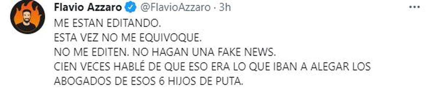 Luego de la repercusión que tuvieron estas frases, el periodista no dudó en salir a defenderse y aseguró que el material que se difundió había sido editado con mala intención para “cancelarlo”. “Esta vez no me equivoqué, no me editen. No hagan una fake news. Cien veces hablé de que eso lo que iban a alegar los abogados de esos 6 hijos de puta”, tuiteó.