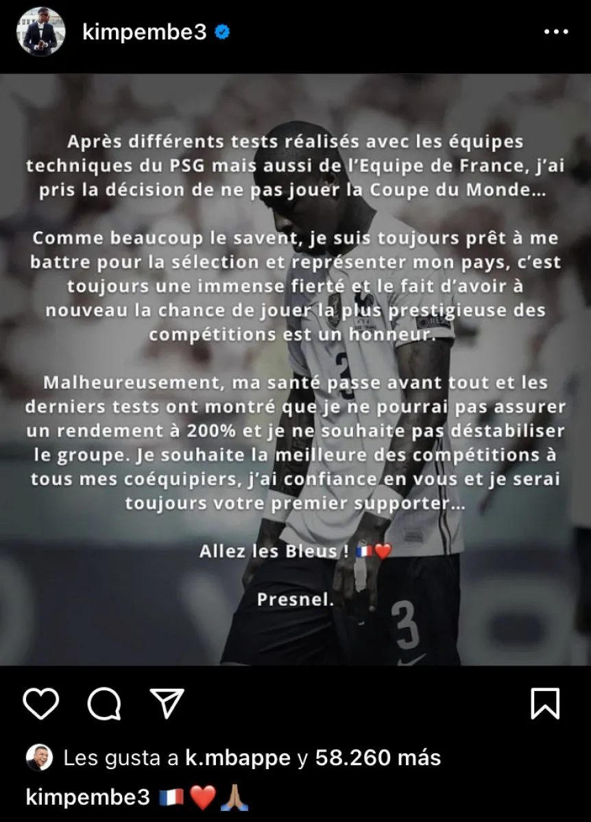 El zaguero de PSG sufrió una tendinitis y, si bien ayer sumó minutos en la goleada del conjunto parisino ante Auxerre, no llegó a recuperarse del todo para disputar la Copa del Mundo. "Insuficientemente recuperado de su lesión, Presnel Kimpembe no participará en la Copa del Mundo. Axel Disasi fue llamado para reemplazarlo", informó la Federación Francesa en sus redes sociales.