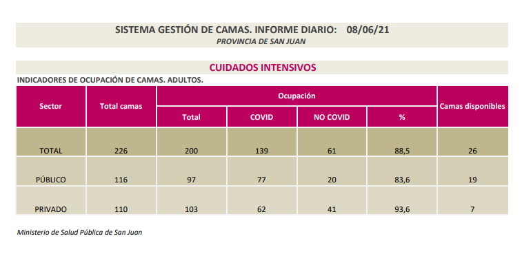 Además, se encuentran internados 303 pacientes en las áreas de COVID-19 (entre positivos y sospechosos) de los hospitales Dr. Guillermo Rawson; Dr. Marcial Quiroga; Dr. Ventura Lloveras, de Sarmiento; Dr. César Aguilar, de Caucete; Dr. José Giordano, de Albardón; Dr. Federico Cantoni, de Pocito; CEMEC; Dra. Julieta Lanteri; Hospital San Roque, de Jáchal; Hospital Dr. Alejandro Albarracín, de Valle Fértil; Hospital de Barreal, de Calingasta; Hospital Privado; Instituto Médico; Clínica El Castaño; Clínica Santa Clara; Sanatorio San Juan y CCI.