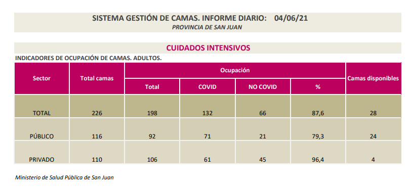 Además, se encuentran internados 303 pacientes en las áreas de COVID-19 (entre positivos y sospechosos) de los hospitales Dr. Guillermo Rawson; Dr. Marcial Quiroga; Dr. Ventura Lloveras, de Sarmiento; Dr. César Aguilar, de Caucete; Dr. José Giordano, de Albardón; Dr. Federico Cantoni, de Pocito; CEMEC; Dra. Julieta Lanteri; Hospital San Roque, de Jáchal; Hospital Dr. Alejandro Albarracín, de Valle Fértil; Hospital de Barreal, de Calingasta; Hospital Privado; Instituto Médico; Clínica El Castaño; Clínica Santa Clara; Sanatorio San Juan y CCI.