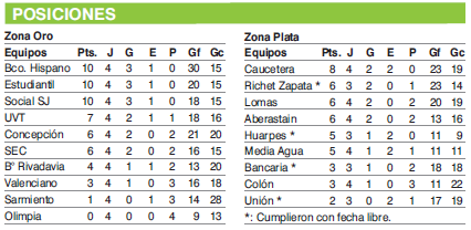 Zona Oro: Olimpia 4-Concepción 5; Banco Hispano 10-Barrio Rivadavia 3; Centro Valenciano 3-Social San Juan 4; UVT 3-Estudiantil 5; Sarmiento de Albardón 3-SEC 8.