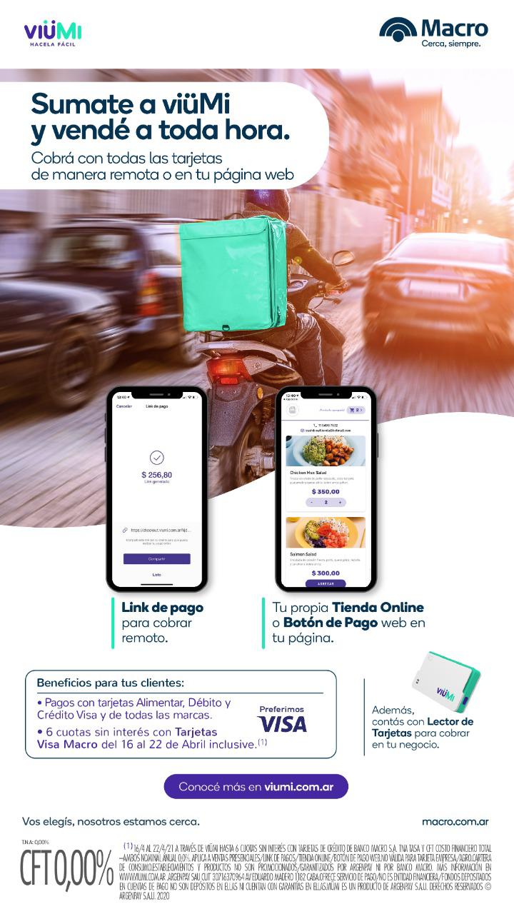 La plataforma digital de cobro viüMi presenta excelentes beneficios para comercios y consumidores. Desde el 16 al 22 de abril se podrá pagar en hasta 6 cuotas sin interés con Tarjetas de Crédito Visa de Banco Macro. Por otra parte, los comercios no tendrán que pagar comisiones por las ventas que realicen en un pago con tarjeta de crédito los días 27, 28 y 29 de abril. Se les bonificarán el 100% tanto de las ventas por tarjeta de débito, crédito y Alimentar.
