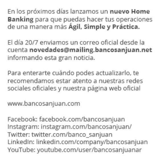 Diario de Cuyo | HOME | Noticias Banco San Juan lanza su nuevo Home Banking Por Redacción Diario de Cuyo 23/07/2021 · 0:00 Escuchar la noticia Escuchar la noticia Your browser doesn’t support HTML5 audio Ver los comentarios ›