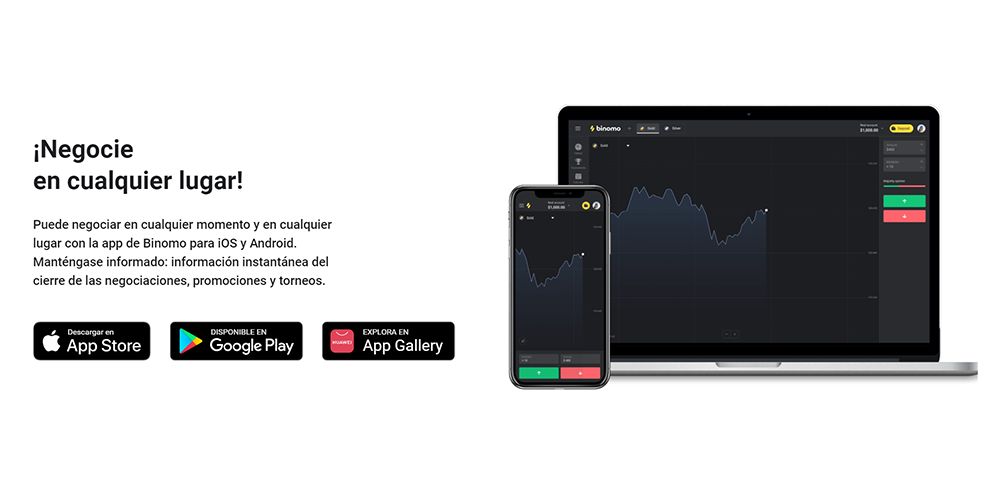 Binomo App está disponible para dispositivos iOS y Android en AppStore y Google Play completamente gratis. Desde la app podrás abrir tu cuenta y realizar todas las operaciones disponibles en la versión web. Para los usuarios de dispositivos Android también se puede download Binomo Apk desde el enlace: https://binomo.com/es/promo/android.
