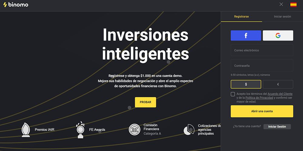 Para usar los servicios financieros de la plataforma debes ingresar a su página web binomo.com y hacer clic en “Regístrate”. Utiliza tu correo electrónico, crea una contraseña para entrar a Binomo. Selecciona la divisa en la que se reflejarán tus fondos (no podrás cambiarla luego del registro). Lee el Acuerdo del Cliente, y si estás de acuerdo termina el proceso. También, puedes iniciar sesión usando tu cuenta Gmail y Facebook.